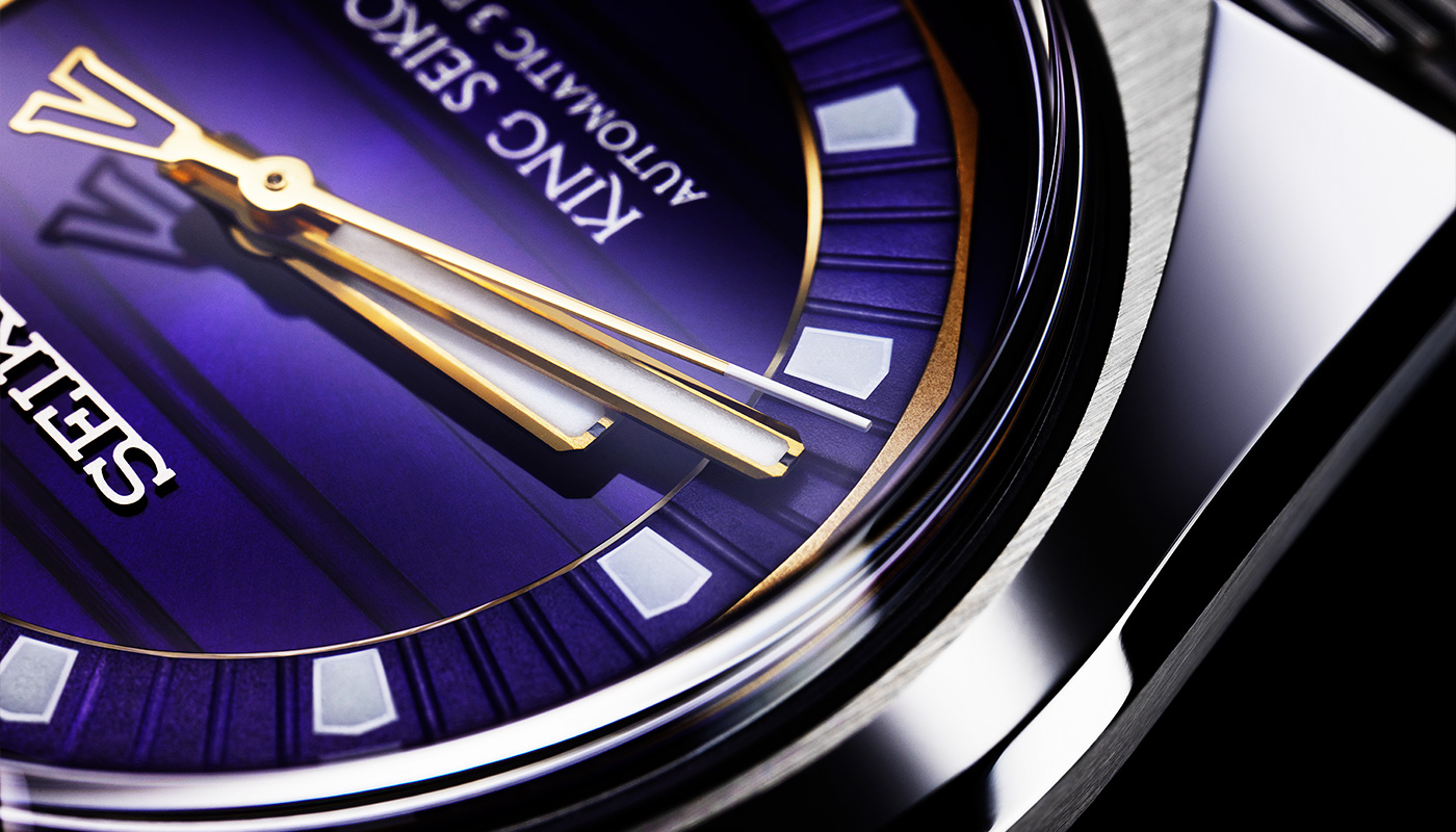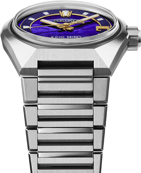 ベゼルを排した大胆な構成の中に、キングセイコーらしい光の魔術が息づいています。多面的に構成されたケースは、稜線ごとに異なる陰影を宿し、動きに合わせて表情を変える力強さをたたえています。