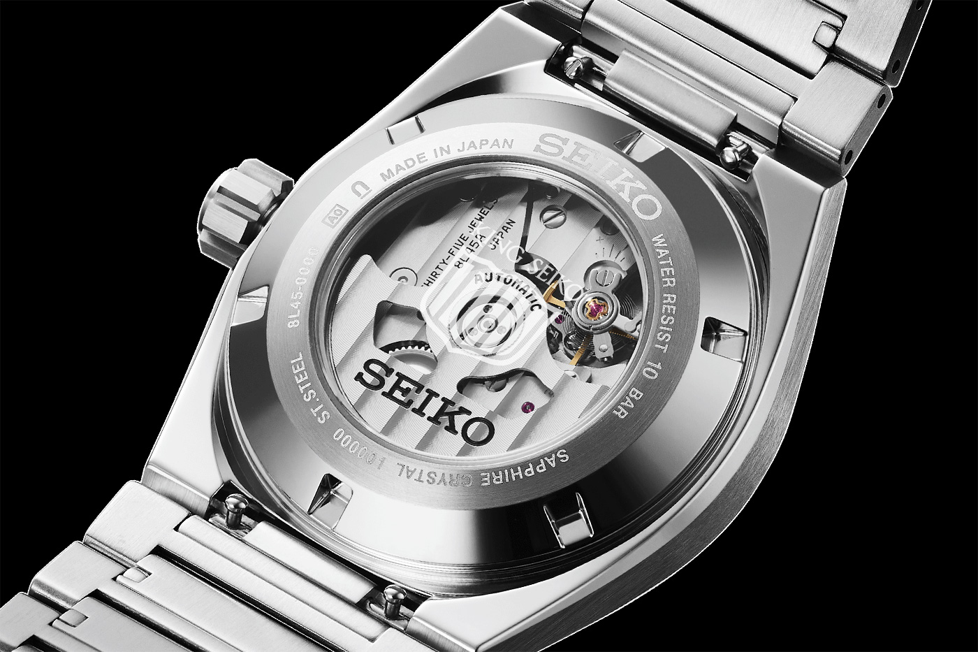 “VANAC”は、2022年のブランド復活以来初めてとなるシースルーバック仕様を採用。ケースの裏側から覗くムーブメントには、日差+10秒~-5秒という高い精度に加え、約72時間のパワーリザーブを誇るキャリバー「8L45」を搭載しています。裏ぶたからは回転錘の波目模様をはじめ、細部まで磨き抜かれたムーブメントの美しさを眺めることができます。またキングセイコーを象徴する「盾」のブランドマークを記しました。力強さと美しさのバランスを表現した、“VANAC”らしいディテールです。