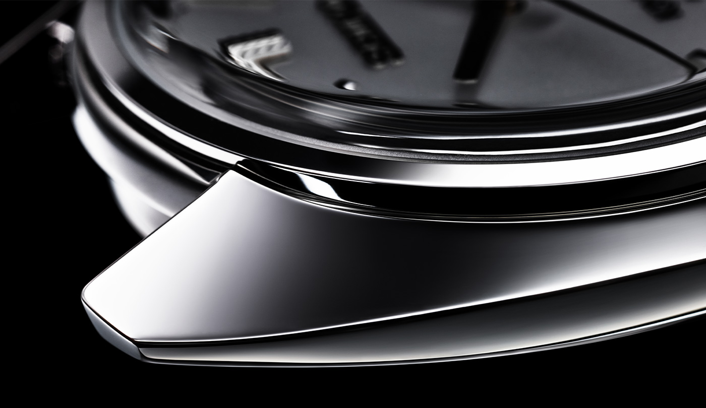 そんなインデックスの中心を射抜くようにして時を刻むのが、3面カットが施された時分針。光を受けるたび、鋭く、そして滑らかに表情を変えるその刃先は、見る者に美しさとたしかな精度を静かに語りかけます。過剰な主張は避けながらも、視認性をしっかりと担保するよう、針の断面には精密な面取りが施されています。光と影の設計が緻密に行き届き、暗所や傾きのある角度でも、光の筋が時を伝えるように輝きを放ちます。