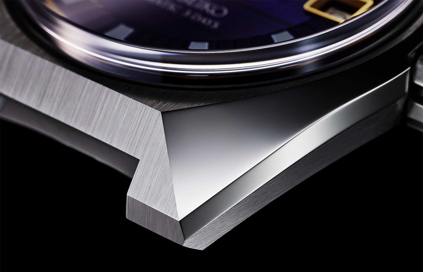 ベゼルを排した大胆な構成の中に、キングセイコーらしい光の魔術が息づいています。多面的に構成されたケースは、稜線ごとに異なる陰影を宿し、動きに合わせて表情を変える力強さをたたえています。